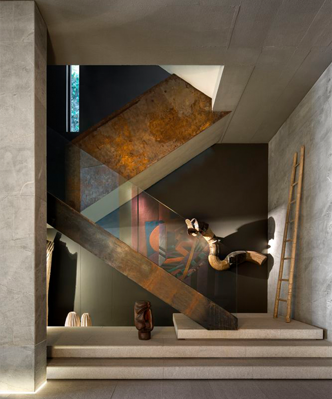 The bold black wall behind it pushes the geometry forward, while the handrail in glass ensures nothing gets in the way. What’s heavy becomes light. And what’s sculptural becomes clear.
