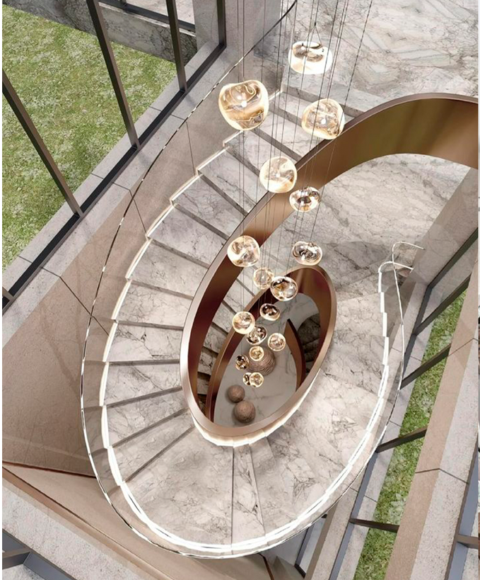 A wider step mid-curve creates a visual breath, and the chandelier at its center doesn’t just illuminate, it elevates like suspended art.
