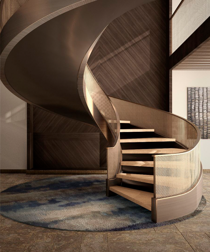 With seamless curves and a bronzed mesh railing, it turns the corner with confidence. The tone-on-tone palette enhances the sculptural form, while the dark wood steps ground it with quiet strength.