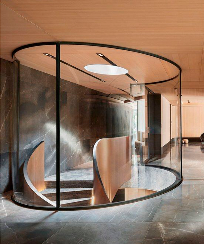 A spiral of innovation, this staircase blends sculptural design with urban elegance. Surrounded by glass, light, and vertical elements, it becomes a visual anchor connecting floors while drawing the eye upward. At the core of this space lies not just movement, but experience: a structure made to be seen, felt, and remembered.