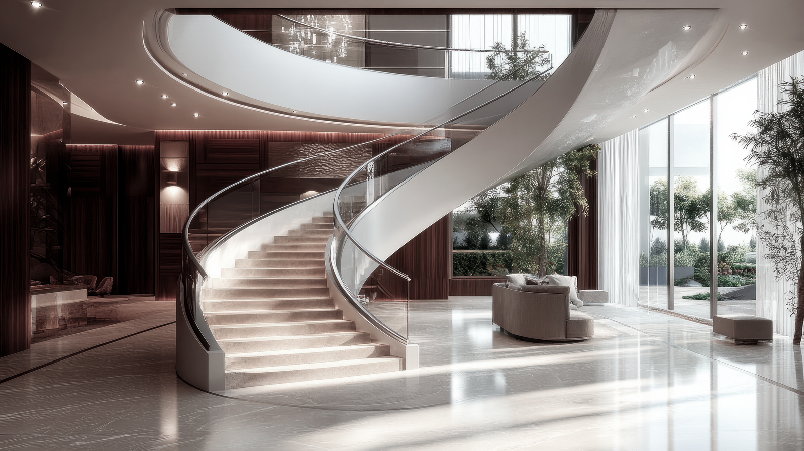 Every element here speaks the same visual language, the marble floor, the staircase, and the copper-toned finish all echo the same muted palette. The curve of the stairs is graceful and continuous, wrapping through three floors with sculptural ease.